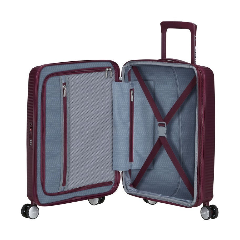The American Tourister Curio Spinner Carry-On suitcase is a Red Dot Award winner, making it an exceptional choice for travelers. It incorporates features such as expansion, a fixed TSA lock, and convenient inside organization, elevating its status as a top-rated suitcase. The integrated TSA-approved lock ensures added security for your checked luggage, providing peace of mind throughout your journey. With extra expansion on the case, you can easily pack all your belongings without compromising on space. The dual Spinner wheels enable effortless navigation through narrow airplane aisles and across various surfaces. Crafted from 100% polypropylene, this suitcase offers extreme durability, and its textured surface minimizes the visibility of scratches. Please note that carry-on standards may vary by airline, so it's important to check with your airline before flying.